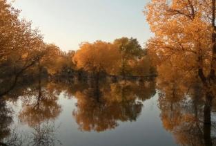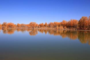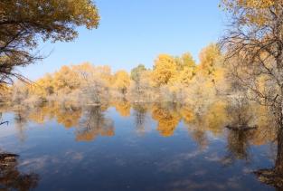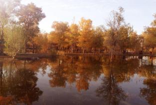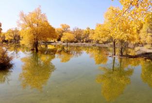 金塔胡杨林,甘肃酒泉的人造胡杨林景区。其特色在于水上倒影,胡杨黄得浓烈,天空蓝的纯粹,水中倒影两种极致色彩辉映,一转眼都是炫目的油画。