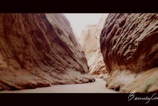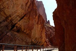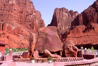 库车大峡谷,大峡谷近似呈南北弧形走向,开口处稍弯向东南,末端微向东北弯曲,由主谷和七条支谷组成,全长5000多米,谷端至谷口处自然落差200米以上,谷底最宽53米,最窄处0.4米,仅容一人低头弯躯侧身通过。谷侧奇峰嶙峋,争相崛起;峰峦叠嶂,劈地摩天,崖奇石峭,磅礴神奇;神洞秘窟,各蕴其意。谷内蜿蜒曲折,峰回路转;步步有景,举目成趣;泉水叮咚,鸟叫蝉鸣,寒暑不浸,游人称绝。整个峡谷犹如一条尾震天山头,口饮库河流(开口于库车河),曲身九十九的巨龙劈山而卧,呼风唤雨,神秘莫测。更令人称奇的是,距谷口1400米深