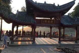 乌石村村里砌房的石头都是黑色的,比较特别。 村子本身比较普通,有意思的是村子可以看日出与梯田。 五点五十到的揽胜阁,已有不少人在此等候。六点零五分左右,太阳逐渐从对面的山头跳出,真是光芒四射,等日出的人们都禁不住欢呼。