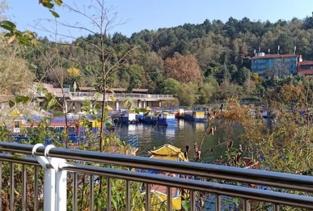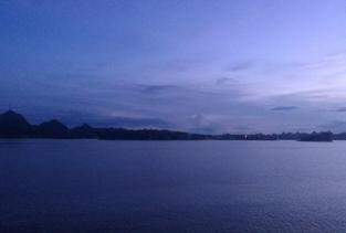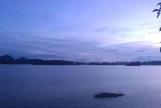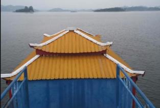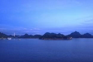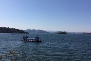 今天游红枫湖,天公便是使出本事,让我们领略不同天光下湖水的不同,水天相接色彩的不同,还有红的游船,绿的小岛在不同光线色彩的不同。 上午到达景区时,空中似乎还飘着小雨,让我不由有一丝雨中看灰蒙蒙一片水面的担心。进入景区,云层已经由灰黑变为厚棉絮,蓝天下游船的大红让湖面有了生气。 后来,白云和蓝天一起,成为涂抹点染湖面的最佳染料,它们有时是背景有时是主题,与红枫湖密不透风的绿岛共辉映。 当然,景区里还有这些人文景观,比如江总的题字。比如侗寨的鼓楼。 红枫湖的名字就让人想起色彩,尤其是期待秋天的万山红遍,水天相