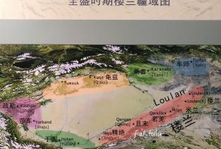 2018.09.28 入新疆翻越阿尔金山后进入塔里木盆地东部的若羌县。到达楼兰市是下午4点,check in后直奔博物馆,这个漂亮的博物馆是免费开放的。在这里看看停停一小时有余。 汉代西域三十六国中的若羌国和楼兰国曾位于此地。当时若羌是一个畜牧业小国;而楼兰有城廓,是丝绸之路,罗布泊一带的重镇。 被一张疆域图所吸引,古楼蘭的地名真是好听的,精绝叫Niya,龟兹是Kuqa。