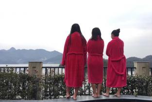 茗阳汤泉环境美,温泉♨️舒服,建在水库半岛上,三面环水,不远处有山,可以坐游船,适合夜跑、晨跑,可以爬山,休闲度假好地方。赞!周末去的,在网络上定了3张票,非常实惠!