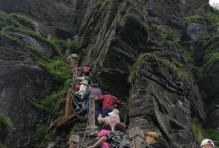 梵净山真的是大自然和人类共同的杰作,很值得一看,乘坐缆车到半山腰,接着就开始攀爬之旅。按照行程路线,先爬老金鼎顶,这个先给大家一个适应的过程,路程还行,虽然高但是不太险。如果这个爬都觉得费劲的话,那么就可以放弃红云金顶了,因为这个真的太险了,一条铁链之隔就是悬崖,而且路很不好走,楼梯陡且险,看到一起爬山的很多年轻人都放弃了,但是父母还是坚持都爬上去了