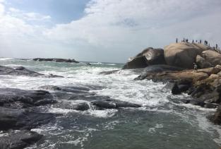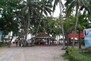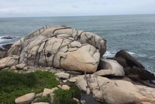 石头公园景色很美,现在也有二路公交车可以坐到石头公园了,游1是从火车站到石头公园,游2是椰子大观园绕高隆湾一圈到石头公园,目前还是免费不收门票。沿着石头公园还可以到右边的一个湾,好像那里有酒店,椰树下有大姐卖郁子,很热情地招呼游客。