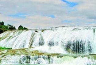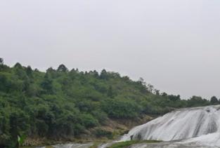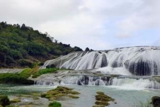 陡坡塘瀑布位于贵州省黄果树瀑布上游1公里处,是黄果树瀑布群中颇具特色的一个天然坝型瀑布。瀑顶宽105米,高21米,是黄果树瀑布群中瀑顶最宽的瀑布。陡坡塘瀑布顶上形成一个面积达1.5万平方米的巨大溶潭,瀑布则是形成在逶迤100多米长的钙化滩坝上。西游记的场景。