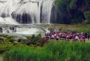 陡坡塘瀑布顶上是一个面积达1.5万平方的巨大溶潭,瀑布形成在逶迤100多米长的钙华滩坝上,是83版西游记片尾的取景地。景区不大,一般40分钟即可游览完毕。