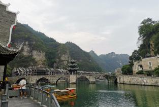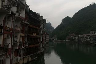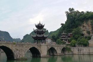 祝圣桥的一头与青龙洞入口相距几米,祝圣桥上有一古亭,祝圣桥、古亭,从桥底下穿过的舞阳河以及不远处的山构成的一幅图就是镇远古城的名片,这是游客必来的地方之一。