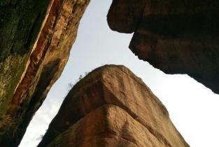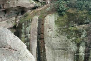 登上八角寨不足两平方米的观景台,放目远眺:一边是湖南新宁丹霞群,一边是广西资源的丹霞山峰群;伸向八方的八个山峰有六个山峰在湖南,两个在广西。长达十余公里幽深莫测的峡谷中,构成一座天然的艺术长廊。