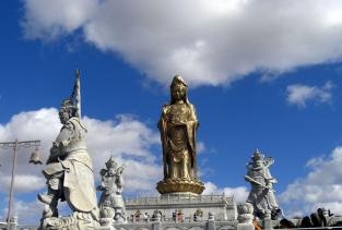 普陀山风景名胜区观音菩萨的道场,素有海天佛国、南海圣境之称。最高处佛顶山,海拔约300米。普济、法雨、慧济三大寺,还有33米高的南海观