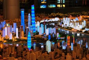 上海城市规划展示馆馆顶4只象征上海市市花白玉兰的巨大檐帽在阳光下熠熠生辉。馆内拥有4展示馆主体高43.3米,总建筑面积18393平方米。其主题是