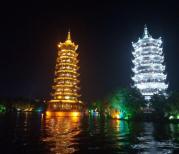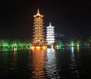 两江四湖是指由漓江、桃花江、榕湖、杉湖、桂湖和木龙湖所构成的桂林环城水系,是桂林城市中心最优美的环城风景带。其环城水系全长7.33公里,水面面积38.59万平方米,这里的夜游很美,在船上还可观赏水系周边的象山、伏波山、叠彩山、尧山、宝积山、