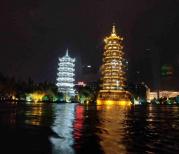 两江四湖游的重点景观就是位于杉湖中的日月双塔。如果说重庆的夜游两江是大家闺秀,那么桂林的夜游两江四湖就是小家碧玉。重要体验是船从高水位到低水位,又从低水位到高水位的切换,就好像船坐了个电梯。船上也有空调,买票后是对号入座,也有人员讲解。