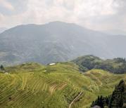 龙脊梯田层峦叠嶂,连绵不断,此起彼伏,像龙的脊梁一样雄壮,绿油油的麦浪密密麻麻,规律纵横的排列在一层层田地里,感叹农民的智慧和耕耘的辛苦,更要践行粒粒皆辛苦的习惯。