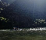 遇龙河两岸山峰清秀迤逦,连绵起伏,形态万千,江岸绿草如茵,翠竹葱郁,树木繁荫。遇龙河的水如同绿色的翡翠,清澈透亮,鱼儿闲游,水筏飘摇,一一可见。微风拂过水面,泛起阵阵涟漪,如同小提琴奏出的音符,静静的,轻轻的。