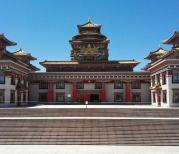 乌兰活佛府,静谧的佛学院,远观是静土,天空湛蓝湛蓝的,五色旗杆让人肃然起敬,建筑恢宏还高大上。进入后,大开眼界,墙壁上精雕细刻,房廊金壁辉煌,连座椅都极用心。