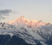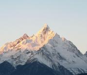 梅里雪山——酒店五层天台正对卡瓦博格,无障碍。在阳台观赏亦是,非常棒。在房间阳台等候日照金山,今天运气太好了,早晨8点左右,太阳出来美如画,梅里雪山峰似金。