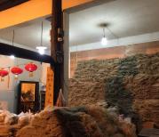 关中的袁家村有些象重庆的磁器口,应该是当地打造的集小吃、地方特色活动为一体的名俗游乐场所。夜间漫布于挂满大红灯笼的村中,吃一碗豆腐脑、看一看张氏皮影的现场制作、坐一坐放着老片子的竹凳茶坊,在那挂满辣椒的门面前、堆积如稻草的手工粉堆中、挂满大