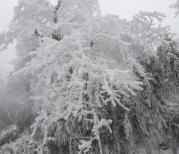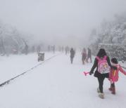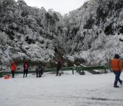 终于踏上了金佛山旅游中巴,绕山盘旋而上约摸行了20分钟车程就到了景区上山锁道。今天天下着毛毛细雨,温度较低,到了金佛山顶上,只见白茫茫一片,地上的雪有三,四寸厚,很多旅客一下锁道就兴冲冲地抓起大把的雪打起雪仗。我是懂事以来第一次看见这么大,