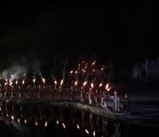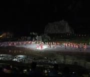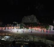 在恩施大峡谷晚上观看《龙船调》,真是一场视觉听觉的盛宴。回味无穷。景区峡谷入口是两壁葱郁的山林,拾梯而上,仰望山顶,天空中艳阳映照,山间有云雾缭绕,心中自是惬意,行过百梯,一路上有奇石,鳞次栉比,或兽或禽,示牌书意有“龙爪石印”、“猎豹回头