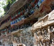 大足石刻堪与敦煌、云冈、龙门、麦积并称的艺术瑰宝,是南方最大也是艺术成就最高的石窟石刻群,以宝顶山为中心,以佛教造像为主,兼融儒道,所有造像都充满了艺术的灵动和连贯的故事趣味,风格独特,与其它石窟迥异。