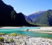 春天的尼洋河充满生机,缓缓的水流绕过高高的河床,岸边的树木刚刚发芽,初春的黄色、蓝色、还有一丝的绿色组成了一幅充满生命的画面,背后的青山藏在白云间若隐若现。现在还不是桃花大面积盛开的季节,等到春来报,河岸上姹紫嫣红造就了如诗如画的锦绣山河。