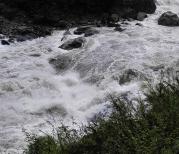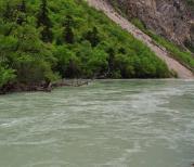 帕隆藏布的江面很宽,两岸植被极为丰富,待层林尽染的深秋,此处一定美极了。山涧的溪水水量充沛,直接冲刷着路面汇入帕隆藏布。帕隆藏布流经的河谷灌木和冷杉丛生,秋分将至,长的着急的叶子已经憋黄了。快至然乌湖段,这一段的高山特别多,因此随着山顶融雪