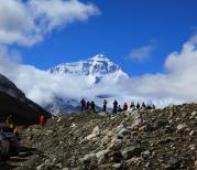 珠峰大本营有武警值守,旁边有一块立碑,上面刻着“珠穆朗玛峰大本营,海拔5200m”字样,游客多在此合影。