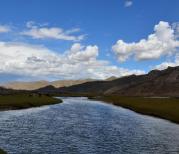 邦达草原是澜沧江与怒江之间的一个宽阔平坦的山间盆地,怒江支流玉曲河在这里蜿蜒曲折地流淌,河两岸是一片片生长着草甸植物的低湿滩地和草场。因为地处藏东,雨水较西藏中西部稍多,加上河流的灌溉,牧草相对也就较茂盛,一路上可见成群的牛羊在草滩上悠闲地