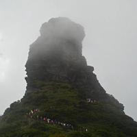 云舍村开车到梵净山售票点就十多分钟的距离,原本我们以为的拥堵其实也没有我们选择的是步行上山,缆车下山,所以门票是220元/人。门口有驴妈妈的工作人员,扫二维码之后是215元。如果有计划去的可以提前在网上订,不过要记得提前几天订好,不然就像我们一样要提早去买了观光车开到索道站门口,其实一路上也有很多好看的地方,路过一个吐水的龙头,还有一个寺庙。爬的途中基本上每隔开500步就会有路牌。当看到600的时候我已经要哭了。山路基本上都是楼梯,开始部分都很陡峭。到达6000步之后楼梯会变成平缓的石梯6600步的梯子,我们从9:30开始爬,到下午三点半左右,过程中有多少次再也抬不起脚。途中遇到卖水的,他每天都是七点半开始背着水和红牛之类的爬上来开始卖,他告诉我们,在途中的话,你叫滑杆估计八百一千不等吧。想了想我们还是咬咬牙吧。踏上木栈道,就会有很多指示牌。基本上是介绍梵净山拥有的植物和珍稀动物之类。有兴趣的可以去看一下梵净山的百度百科,相信你一定会对这里有兴趣的。
