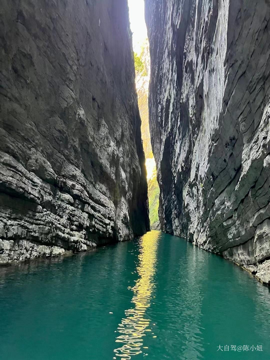 湖北鹤峰屏山躲避峡春游探索之旅 在马来西亚沙巴州斗湖省,有一个名叫仙本那的县,因其风景如画、海水清澈见底,游船漂浮感十足,成为著名的旅游胜地,为世人所向往。没想到,在咱们湖北也有这样一个现实世界中的梦幻之地——鹤峰县屏山躲避峡峡谷鹤峰县,是一个全国少有的五无县城(无高速,无铁路,无机场,无轮渡,无高铁),所以这里的生态环境保护的非常好,还基本属于原始生态环境,这里的景色更是世界一绝,只是现在还没有被开发,也并不怎么被世人所了解,我就是一个地道的鹤峰本地人,由我来给大家讲讲我们这里神秘的美景--鹤峰屏山躲避峡。2018年3月10日,天气比较好,因为有朋友需要在屏山景区内踩线和摄影以便后续的推广,所以要求我陪他一起前往,早上9点左右我们一行驾车从鹤峰县城出发了,经过云南庄到加油站加油,然后驱车直上,经过朝上坡,张家坪,杨柳坪,从杨柳坪下面的大拐弯处【有2个小商店的那里,路边有县政府立的关于屏山景区的公告】分路上小路,沿小路到石龙洞【这里有正在开发的哈佛喽景区】过小桥沿途小路前往新寨村猫子湾,在前行1公里左右,抵达前往躲避峡景区的岔路口【那里有立一个躲避峡农家乐的大牌子】向下大概1000米抵达躲避峡【老丁头农家乐】,在那里换了雨鞋,雨衣以及手机防水袋后,老丁头农家乐的下面的船工兼向导就上来接我们来了,我们跟着船工然后步行一路下行【因为走的是下坡,感觉15分钟就抵达了峡谷,挺轻松挺快的】抵达了峡谷了,在船工给气垫船充气的功夫,我们也马上整理了一下装备【照相用的设备】然后开始了神秘的躲避峡之旅,那里的河水太清澈了,就连河里最小的小鱼在水底游来游去我们在上面的看的一清二楚,感觉就跟玻璃一样的透彻,要不是小浆划起的水花,就像是在玻璃上滑行,河水清澈见底,碧绿悠长,在阳光的照射下,溅起的小水花就像珍珠般的剔透,船只仿佛就飘在空中一样,一路的摄影师用相机咔嚓咔嚓的摄个不停,记录着这最美的美景,这里的水最深处可达30米,却仍然能清澈见底,一路上行了几个河滩以后,到了浅水去,由于太浅,无法划船,下船后漫步在水中,船工拖着游船上行我们就一路拍照,走了几步以后又是乘船前行,就这样走走停停,沿途经过了他们所说的‘水帘洞’‘花果山’‘碧龙潭’等等各种稀奇古怪的名字之后,到了一处瀑布处,几块大的石块挡在了河道中间,水流比较湍急,溅起了白花花的水花,上面的瀑布细软缠绵,似新娘的纱裙飘逸在山间。