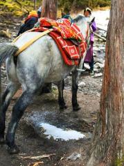 长坪沟是四姑娘山的三个景区之一,这里门票加旅游观光车票每人90元,景区比较大,海拔在3300左右比双桥沟好点,观光车到达景区门口后里面有2个选择,骑马或徒步。骑马有长距离和短距离,老人孩子们最好选择短距离的(到枯树滩),有体力的可以再多走走逛逛,而且建议进去骑马(100元)出来步行比较合理