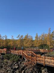 石塘林是阿尔山国家森林公园的一个景点,被称为火山地质博物馆。石塘林的景色不在于山水,而是真真正正的火山喷发遗迹。目力所及和足迹所达的范围内,全部都是错综崎岖、沟壑纵横的熔岩凝结块,堪称壮观。 我们看到了绳状熔岩、龟背状熔岩、喷气碟、喷气锥等等。虽然景色不是最美,但是非常特别,而且学习到了很多火山的知识。