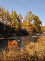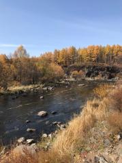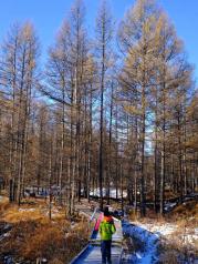 【走在阿尔山三潭峡】 三潭峡是阿尔山国家森林公园里的一个小景点,相较于杜鹃湖、阿尔山天池等地的风景,它并没有多少惊艳。但是金秋的早晨,走在木栈道上,除了我们一行人的脚步,似乎只有哈拉哈河在忽远忽近地歌唱。走在哈拉哈河岸边,看”逝者如斯夫“;当哈拉哈河远吟时,金黄色的松针掉将下来的声音都是这么清晰。 在三潭峡,只需要缓步慢行,全身心的投入到金黄色的落叶松的怀抱,感受舒适惬意的秋晨。 【名字由来】三潭峡由卧牛潭(河水平稳,如庞大的牛群静憩河中)、虎石潭(有形态各异的巨大岩石,宛如虎群在河中玩耍嬉戏)和悦心潭(峡谷尽头)三个潭组成。哈拉哈河在岩石之间穿梭,忽而湍急如珠飞玉卷,忽而沉静似深不可测,与景