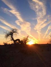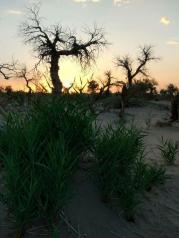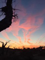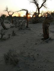 额济纳胡杨林——一道道奇丽无比的霞光从落日西下的天际喷射而出,照在怪树林上,刹那间被染成更加绚丽的晚霞,在天边铺开一幅灿烂缤纷的锦缎,七彩的颜色在天空上尽情挥洒,使人禁不往欢呼雀跃!