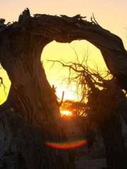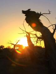 所谓“额济纳树林”,是数百年前因自然灾害——极端的干旱而致成片的胡杨枯死,且干燥的环境让胡杨枯而不腐、挺立不倒,才使今人能观赏到形状各异的胡杨造型。在历史上黑城国战士战死沙场的演义之下,怪树林仿佛是阵亡将士的木化,呈现出一派凄凉景象。到此一游,让人心生奇想,别有情趣。