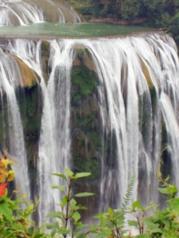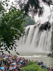黄果树大瀑布果然名不虚传,去时为工作日,未入景区,便见人山人海,可见其爆棚人气。进得景区,先是穿过一处盆景园,之后乘坐自动扶梯往下,出扶梯,远远就可听见水声轰轰,近观之,白练如泻,从天而来,气势非凡。据介绍,黄果树大瀑布水量最充沛的时节是在七八月份,此时雨量丰富,因此瀑布水流湍急。而正是由于水量太大,因此夹杂有大量泥沙,水体也呈黄色,观赏效果不算最佳。而九月的黄果树,水量较七八月略少,但比其他时节又多,不失飞瀑气势,水色又清澈白净,此时游赏,恰逢其时。