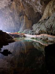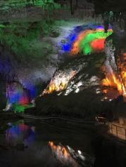 百魔洞规模宏大,巨大的石笋林立,最粗的需要几个人合抱,最高的直达40米高的洞顶,令人惊叹!在前后洞的连接处有一个巨大的天坑,坑底植物繁茂,甚至还有一颗植物界的活化石——桫椤!后洞内的钟乳石更是千姿百态,有的像雄狮,有的似猿猴,有的像山峰,有的似瀑布......在灯光的映射下色彩斑斓,使人产生出无限的遐想!最值得称道的是这里的空气,新鲜潮湿,负氧离子每立方厘米高达6万个,对于久居霾都北京的我们来说,来这里就是“洗肺”!