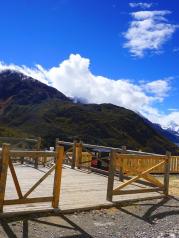 时间关系,舍弃了2个景点而坚决保留了来古冰川,事实证明,没错。 不说一路的无边秋色,就是站在最高观景台面对来古冰川的那一刻,一切都是值得的。 秋色映衬下的来古冰川,远比我们想象的冰清玉洁更令人着迷。来古村静静地依偎在群山的怀抱里,冰川在不远处暗自涌动,默默地与村子相望相守。 景区前后两个冰川观景台。上面一个更往里走,在更高处,景观很壮美。但下面一个离冰川更近,能更多地看到冰川融化后的真实场景。