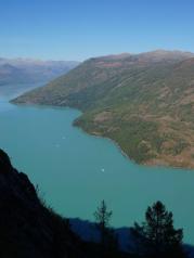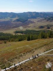 观鱼台位于喀纳斯湖西岸骆驼峰顶上,是俯瞰喀纳斯湖全景的最佳角度,也是为了观湖怪而建的。据说举目北望,能清楚地看到阿尔泰山的最高峰——友谊峰。哪儿是北?城里的孩纸找不到北,555~~~ 下了区间车,开始沿着石阶爬山,一路爬山、一路观景、一路拍照。 爬了1068个台阶,终于到达山顶观鱼台亭子。一边喘气,一边在亭子内往外看,找最佳角度继续拍照。 拾阶而上,映入眼帘的喀纳斯湖面逐渐扩大。 再上台阶,能看到远处的喀纳斯湖被积雪覆盖山顶的山遮挡住了。 观鱼台形象是根据喀纳斯湖怪的想象来建造的,木制结构。 拍了几张照后,赶紧沿着木制栈道下山。 走了几步,看着蓝天、远处的雪山,以及栈道两边开始泛黄的松树