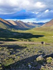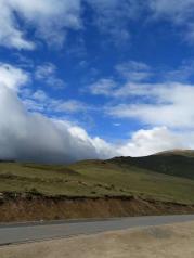 安久拉山垭口十分平缓。站在安久拉山垭口举目四望,到处都是一块接一块的草地,草地与草地之间是小小的积水潭,当地人称为海子。垭口十分平静,没有寒风呼啸,远处的雪山在云层之中若隐若现,而下坡的汽车也渐渐的消失在了路的尽头