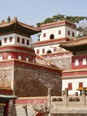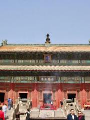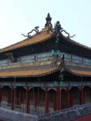 承德避暑山庄班禅行宫。乾隆七十寿辰时,为前来拜寿的西藏六世班禅而建。与小布达拉宫相比,行宫风格更接近于汉地寺庙形制,设一条明确的中轴线,主要建筑依次排列。正殿名妙高庄严殿,四方檐顶铺以鱼鳞状鎏金铜瓦,四条檐脊上装饰八条金龙,据说每条金龙重一吨。可见乾隆为结好藏地领袖,不惜金银,颇费了一番心机。