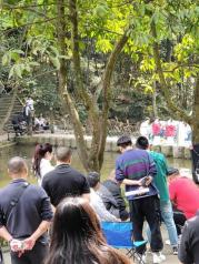 歌乐山国家森林公园缆车几乎没人乘坐,好像一人50,不知道现在涨价了没有。 一会儿就到山顶,山雾缭绕啊,而且湿度太大,没有多做停留。 山顶上有几个当地女孩儿铺着垫子,在这样的湿雾里,坐着开心地聊天⋯ 下山半道买了2根冰棍雪糕,价格和景区外差不多。