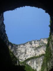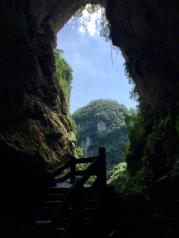 小寨天坑风景区位于距奉节县城91公里的荆竹乡,天坑坑深666米,是目前世界最深的天坑。从坑口沿着峭壁上的台阶,步行下到坑底,一路欣赏自然风光及坑壁上的小瀑布。途中有两级台地:位于300米深处的一级台地,台地上有农家可以休息;另一级台地位于400米深处,坡地上草木丛生,有小路通向坑底。坑底有路通往观景台,在这里仰望,可以深深的感受到“坐井观天”的含义。世界最大天坑,楼梯爬得我直不起腰,估计有三千多档,景色还是不错的,空气也好,坑底比较潮湿。地缝也玩的比较有趣味,缝底好像是乱石岗,又像一线天,各种石头形状不一。
