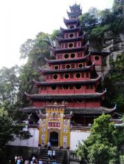 石宝寨位于重庆市忠县境内长江北岸,因此地临江处有一块十多丈高的巨石,相传为女娲补天所剩的五彩石,故称:石宝。明代谭宏起义,曾占据此处以为山寨,石宝寨故而得名。石宝寨倚玉印山而建,倚山势而起,造型奇特。由寨门、寨身、阁楼(寨顶石刹)组成,共12层,全木质结构。始建于明万历年间,原为9层,隐含“九重天”之意,顶上3层为1956年修补建筑时所建。寨顶筑有古刹天子殿,以岩为墙,巍峨壮观。古刹后殿,有一石孔,口大如杯,称“流米洞”。寨内有三组雕塑群像,其一为巴蔓子刎首保城的故事,其二为张飞义释严颜的三国故事,其三为巾帼英雄秦良玉的故事。寨顶有古刹一座,名“兰若殿”;寨下有古朴雅致的石宝街。石宝寨也是中国