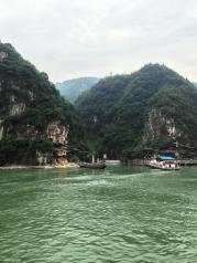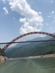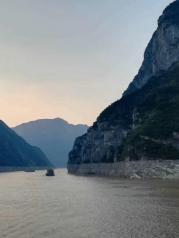瞿塘峡,三峡的第二个峡谷,由于是枯水季节,江面上有一节裸露的岩石。两边的山峰高低错落有致,非常的险峻。这么陡峭的山峰,还有建筑,不得不佩服人类的伟大。