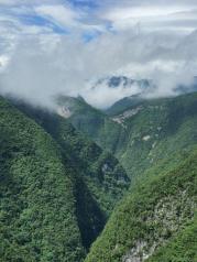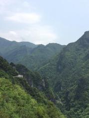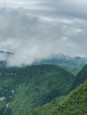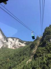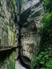 武陵山大裂谷景区行程安排很合理,基本是步行下山+电瓶车+平路步行+上山索道的行程,全程步行六七公里。 景色最美的是天门洞,如刀削般的山崖面开出一个山洞,索桥连着另一面山,周围群山环绕郁郁葱葱,山顶微风袭袭很凉爽。裂谷里面很凉快,抬头可见一线天,低头可见裂谷内溪水潺潺,起码走了半小时才出来。