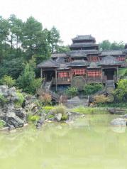天福官驿因为张艺谋的那部电影《满城尽带黄金甲》火了,里面其实不大,但在天生三桥的青山包围中这么一个古代馆驿显得特别好看,里面一直在放电影里的相关片段,终日不停。就在天坑入口附近,从景点大门口要坐电梯下去,然后就可以看见了,很多电影都在这里取景,景色不错,从上面看效果比较好,还不错。