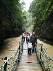 黑山谷景区简单来说就是山和水,进景去之后,开始两三个小时的狂走,途中有很多吊桥,路不是很宽,进出只有一条路,所以很拥挤,路途也没有什么可以看的,就是水和山,空气挺好的!最后走缆车,那速度超级慢!整个景区风景都很美空气也好,家里人玩的很开心。