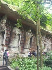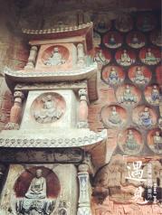 大足石刻有宝顶山石刻,北山石刻,南山石刻等众多石刻点组成。其中宝顶山石刻规模最大,保存最大。景点外几百米长的大道,住满了从全国各地移来的高大的银杏树。 用石刻刻画了地狱里的判官,以及小鬼搅动的,准备实施下油锅酷刑的油锅。