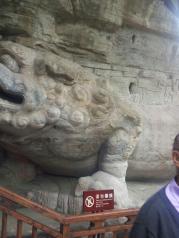 我在不大的宝顶山看到的则是民俗气味浓郁的雕刻,突然我有些明白,为什么大足石刻一直游弋在我国第四大石刻的位置上。 看到在入口处迎接游客的乘牛道祖和伏虎山君的雕像时,我的兴趣就无限的高涨了,你有见过斜眼的道祖和瞪眼的山君吗?而且两位还都貌似都撅着嘴,如果说他们是这宝顶山的山神,那两位保不定是因为争个正副职位刚刚拌过嘴吧。 圆觉道场是整个宝顶山石刻中的精华,还没有进到道场内,就已经开始为洞口的石狮子惊叹了,和常见的蹲坐的石狮不同,这只狮子是俯卧着的,它背部拉伸着起伏的曲线,似乎正在蠢蠢欲动的想要跃进洞内一样,让一众看客更加增添了对于洞窟的好奇心。